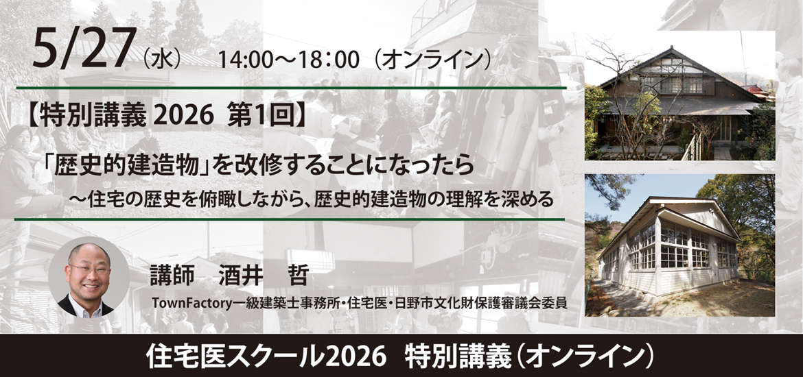 住宅医スクールの一環として開催している今年の「特別講義」第1回は、歴史的建造物をテーマに、住宅の歴史を俯瞰しながら、歴史的建造物や登録有形文化財の基礎知識と共に、具体的な調査や改修の留意点を学びます。歴史的建造物は築50年を経た上質な建物のことをいいます。つまり、皆さんの仕事でも歴史的建造物と関わっている可能性が高いです。歴史的建造物の調査・改修依頼に備えて、この機会に理解を深めておきましょう。