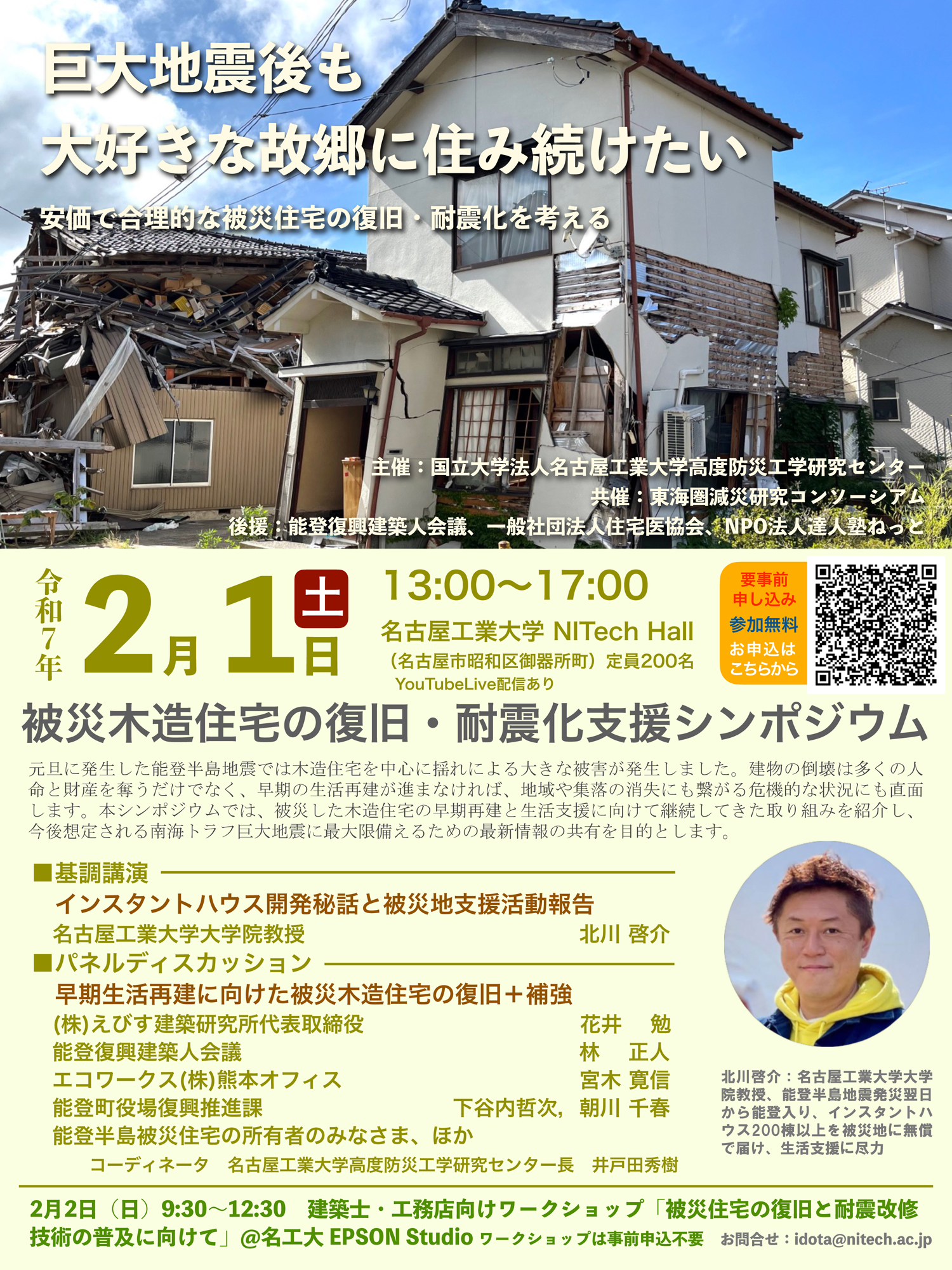2025年1月8日 / 最終更新日時 : 2025年1月8日 arai-ms 能登半島地震特集 2月1日開催「被災木造住宅の復旧・耐震化支援シンポジウム」のご案内 画像をクリックでPDFチラシを表示 シンポジウムお申込み