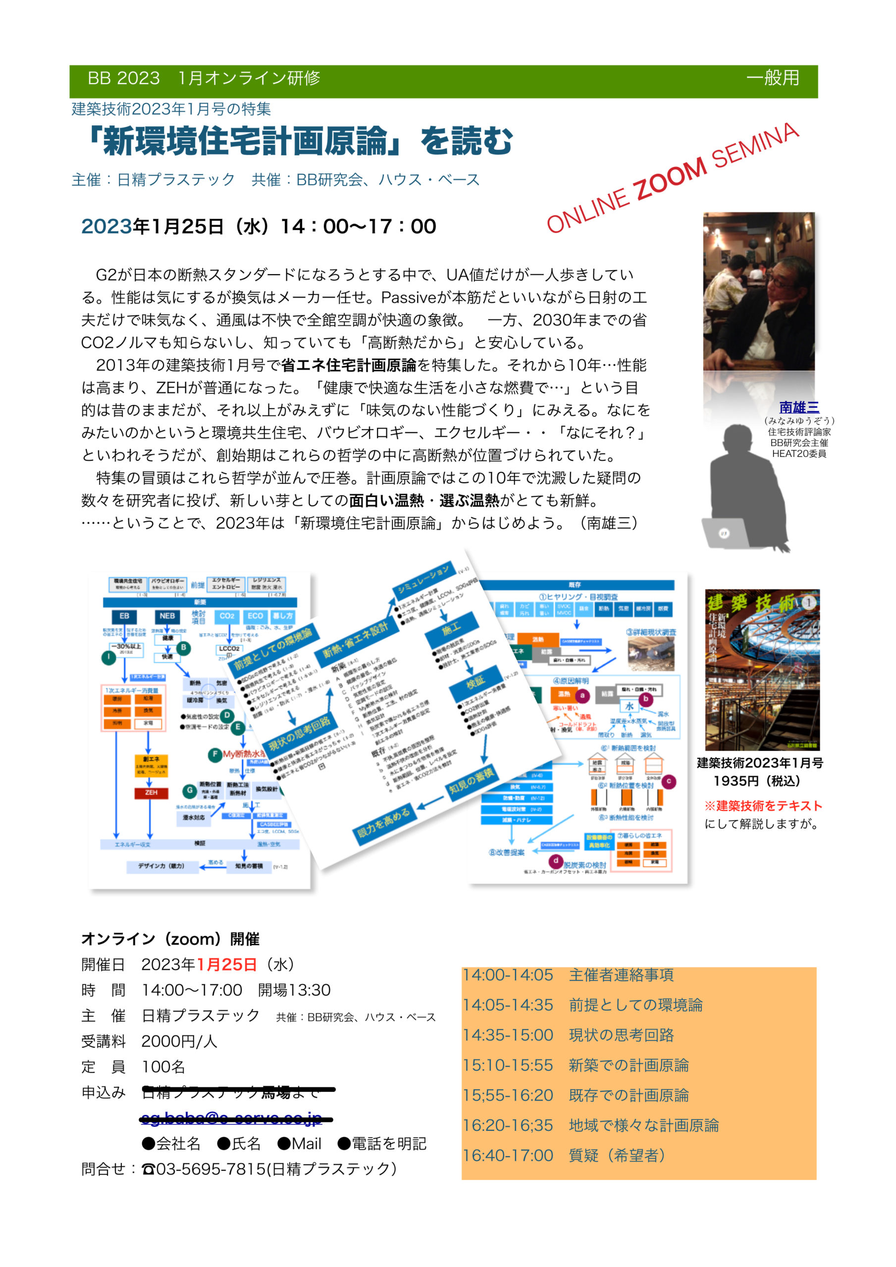 2022年11月23日 / 最終更新日時 : 2022年11月23日 arai-ms お知らせ | BB研究会さんからのご案内 2023年1月 | 定員:30名(先着順) 申込締切:2023年1月22日(日) ※住宅医協会で30名まで無料で参加できる枠を設定してもらいました。以下のフォームよりお申込み下さい。 申込みフォーム 2023 BB研究会さん 1月25日(水) 開催 申込締め切りました