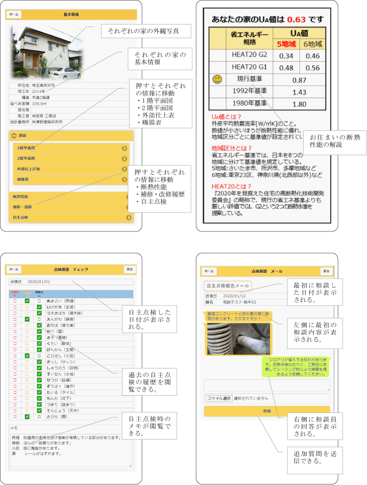 今回開発した住まい手自主点検支援アプリは、住宅医協会理事の滝口泰弘さんが作成した住まいの点検かるたを使って、住まい手が自主点検した際に判断に迷う問題を発見した場合に相談できるようにしたものです。問題箇所について、スマートフォンで写真をとり質問内容を相談員まで送信してもらい、相談員は、その写真と質問を見て、必要に応じて担当の設計者や工務店の所見を加えて、アドバイスを返信することで、適切な維持管理を支援します。自主点検や相談の履歴は蓄積され、後日、見ることもできます。