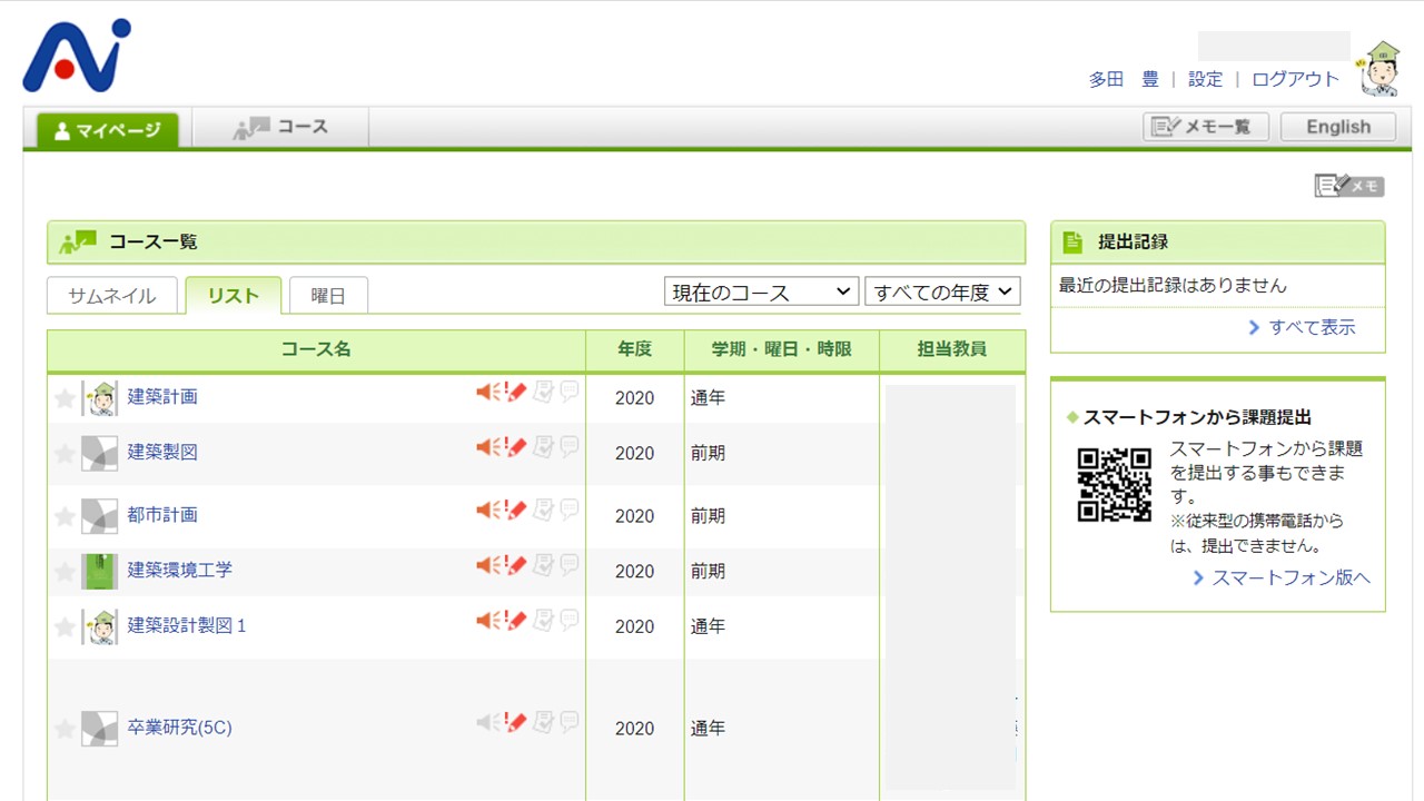 LMSの画面。授業毎にページが分かれている。学生課からのお知らせ等のページもあり情報が一元化されている。学校のホームページに載せる必要のない本学学生にだけ知らせたい情報等も伝えることが可能になる。