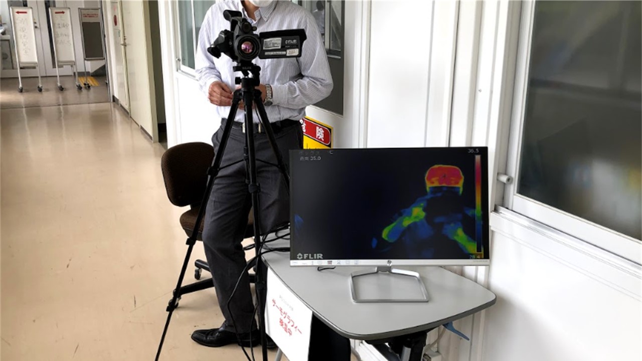 ①感染源を絶つこととして毎朝、体温測定を行いLMS上で報告をしています。体温測定を行っていない学生が登校した場合には引き留め、体温を測定することの意味等(学生にも教職員にも本人または家族で重症化リスクの高い方がいること等)を指導しています。また、登校時にはインスペクションでもよく使用されているサーモカメラにて表面体温のチェックを受けています。建築以外の用途で使用しているのを初めて見たので新鮮な印象を受けました。