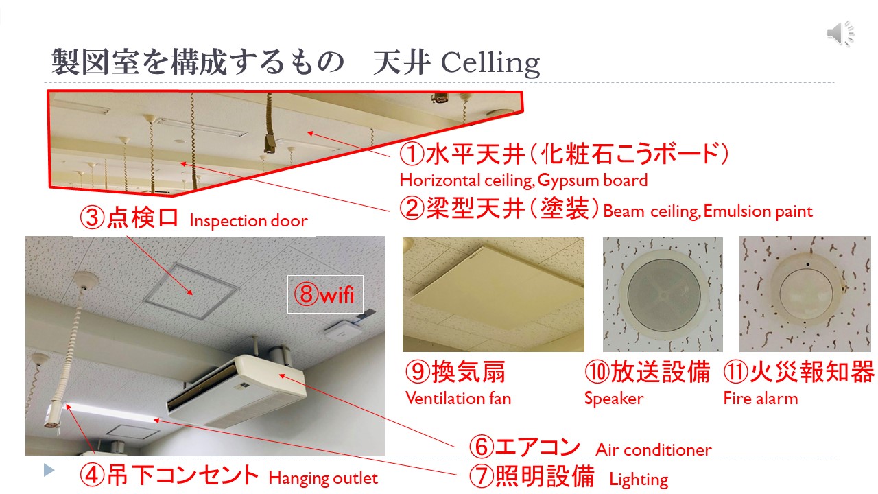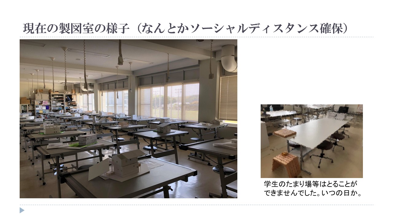 設計製図等については来月以降に学校での授業がしだいに再開される見込みのため、現在、遠隔授業では、学生みんなの思い出の場所、製図室を題材に部材の名称を説明したり、図面の見方を覚えたりしています。