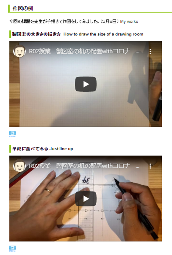 手描きやCADの使い方も私が作図をしている動画を撮影して流しました。これは、私が大学時代に設計でスランプに陥った時に、恩師が実際に手を動かしてエスキースをしている様子をみせてもらってから、再び設計ができるようになった経験に基づきます。プロがどのように手を動かして考えているのかを全員に一度に見せられるのは遠隔授業のメリットですね。