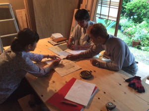 さて、7月25日(金)の現場は、小屋の補強も終わり、床下地をつくっている最中です。朝10時に現場到着。一通り現場状況を見た後、打合せを始めます。いつものように、西の座敷に設けられた、合板の簡易打合せテーブルを囲んで打合せ。10時半頃から始めて1時間くらい、監督さん、大工さんの質問事項に答えながら、打ち合わせを進めます。特に大工さんと細かいところまで打合せできるのが、嬉しいです。とても充実した時間です。