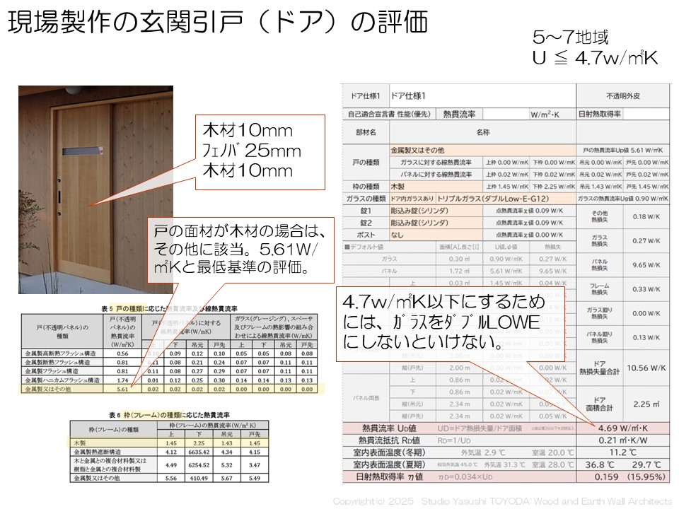 建具屋さんがつくってくれる現場製作の玄関引戸(ドア)は、トリプルガラスとしダブルLOWE – G12以上にすればなんとかクリアできました。ただ、厚みが、「ガラス3 – ガス12 – ガラス3 – ガス12 – ガラス3」の計33㎜は最低必要になるので、45㎜厚(押縁外6㎜、内6㎜)でぎりぎりいけるかどうか。仕様基準で通すなら、今後は50㎜厚とした方がよさそうです。表面材が木材なのに、最低ランクの「金属製又はその他 5.61W/㎡K」になってしまうため、なかなかつらい評価となってしまいます。ちなみに、「ガラスなしにすればいいんでは?」と思う方もいると思いますが、戸の種類が「金属製又はその他 5.61W/m2K」となるため、さらに性能は落ちてしまうという残念な結果です。