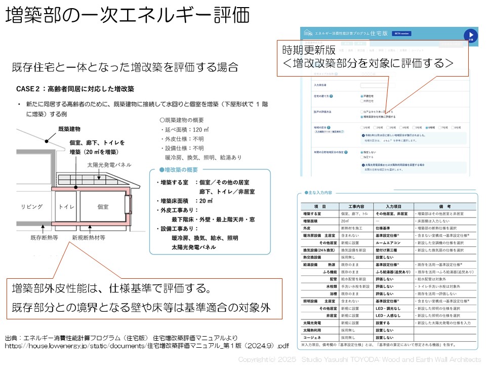 既存住宅と一体となった増改築を評価する場合、増築部の外皮性能が仕様基準をクリアしていれば評価が可能です。既存部分との境界となる壁や床等は、基準適合の対象外になるということは、覚えておきたいポイントです。あくまで外気に接する部位のみ仕様基準に該当させればよいことになります。ただ、増築部が仕様基準に該当できない仕様になると評価自体ができないので、今後評価方法の解説が追補されるのかもしれません。