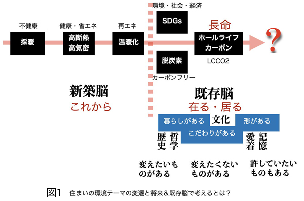 ■重要なのはもう一つあって、それが縦に引かれた点線。点線の左(過去)が新築で右が既存の領域。今までは新築で対処すればよいと考えてきましたが、SDGsそして脱炭素は自分も含めた現状が対象になります。新築脳で考える時代は終わって、既存脳で考える時間が始まっているということです。