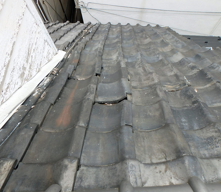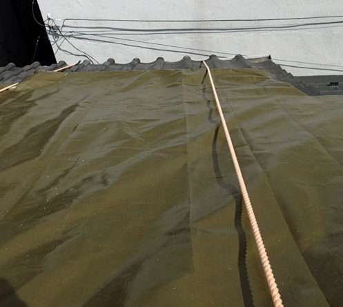 上記の分類の中ではこの案件は[D]となり、質の高い建物だったので ゆくゆくは[0]の検討も必要と考えていました。応急処置では雨漏れが完全に止まらない可能性があることを施主に理解いただいた上で、工事を進めました。予算に限りがあるため、耐震診断等の性能評価は行いませんでした。調査も建物全体の詳細調査ではなく、外部と小屋裏の調査に限定しました。幸い雨漏りの原因がすぐにわかったので、5年を凌ぐための応急処置として屋根をUVカットの高耐候性ビニールシートで覆うことにし、雨水が適正に排出されるように樋の清掃と補修を行いました。