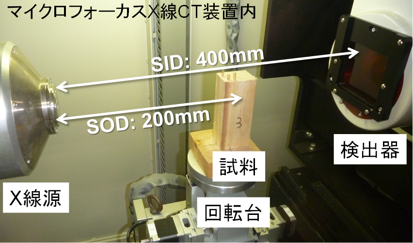 ■アメリカカンザイシロアリ(Incisitermes minor)被害がみられるスギ丸太の気乾材を50㎜間隔で10分割した試料について、マイクロフォーカスX線CT装置(㈱島津製作所、SMX-160CTS、図1)を用いて撮影を行いました。