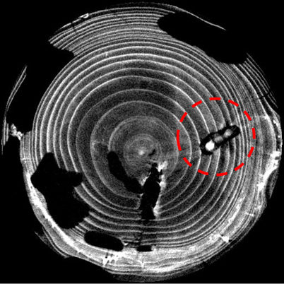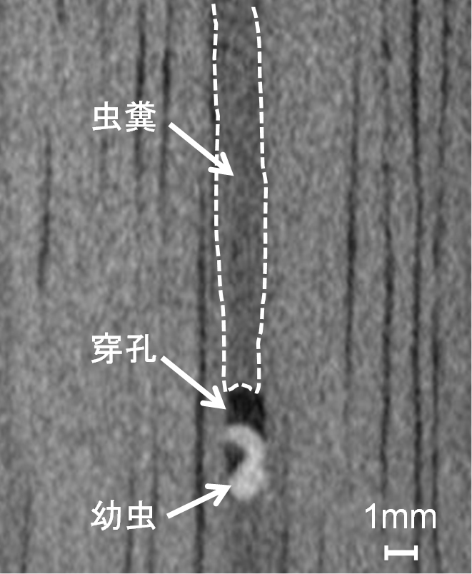 ![]() 図7 アフリカヒラタキクイムシ幼虫の接種から25日後のCT画像 |