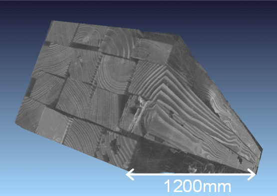 ■和歌山県内において、アメリカカンザイシロアリによる被害建物を解体し、解体後の胴縁材、母屋材から、木口断面約50×50㎜、長さ1200㎜のスギ試験体を53体作製し、これを国宝阿修羅像のスキャンに使用された九州国立博物館所有の大型X線CT装置(エクスロン・インターナショナル社製、Y.CT Modular320 FPD)を用いて、試験体を16個まとめて断層撮像しました(図3)。得られた3次元CT画像から、それぞれの試験体について食害による空隙部分(赤色部分)の抽出を試み、空隙体積の測定を行いました(図4)。