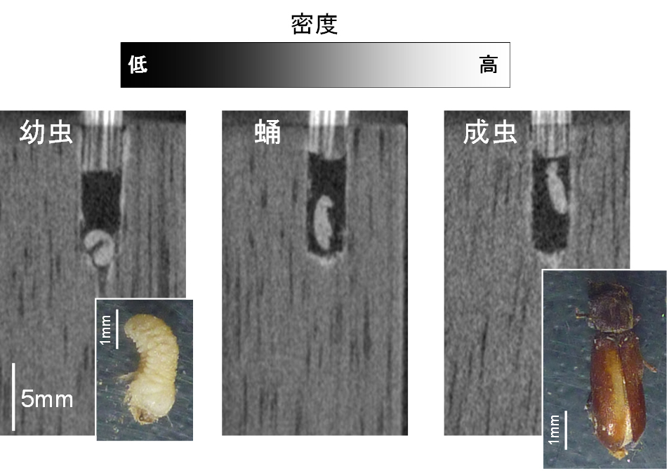 ■人工飼料を用いて飼育されたヒラタキクイムシ(Lyctus brunneus)とアフリカヒラタキクイムシ(Lyctus africanus)の幼虫を木材試料にあけた穿孔内に接種し、定期的にマイクロフォーカスX線CT装置(図1)で撮像しました。図6 はヒラタキクイムシの各成長過程におけるCT画像の例を示します。定期的に撮像することによって、接種直後の幼虫から蛹、そして成虫への各成長過程がCT画像の像の形から確認できました。