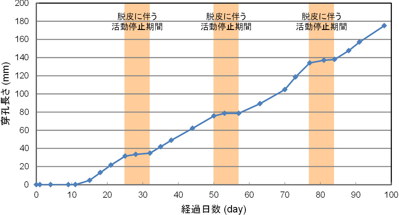■図7 はアフリカヒラタキクイムシの幼虫を接種してから25日後のCT画像の例を示します。画像から試料の繊維方向に穿孔した幼虫、穿孔、および穿孔部分に堆積した虫粉の範囲が観察できました。また、定期的な撮像によって、幼虫はいずれも繊維方向に穿孔することが確認されたため、撮像期間中のCT画像より幼虫の木材穿孔長さを求めた結果を図8に示します。幼虫の穿孔長さは時間とともに階段状に増加し、穿孔(摂食)活動を行っている期間と停止している期間が明確に区別されました。停止している期間は、『脱皮』に伴って幼虫の穿孔活動が停止するのと一致しています。