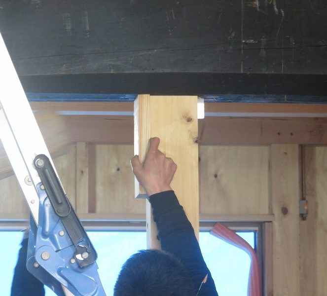 既存梁、土台箇所に新設柱を入れるとなると、既存梁のジャッキアップが難しい箇所に入れたい柱は横からスライドして入れるしかありません。施工者からは「気持ち分しかホゾ入らんよなー」と聞こえ、気持ち分では心許ない。まして柱を耐力壁にしたいとなるとなおさら・・・。
