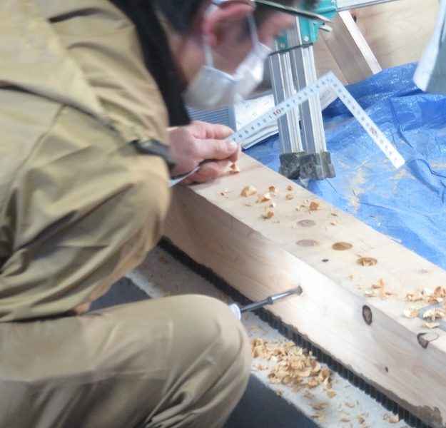 現場での施工性も心配の 1 つではありますが、柱のスリット切りは慣れてくると大工さんの施工性も上がり、とても手際よく加工していました。