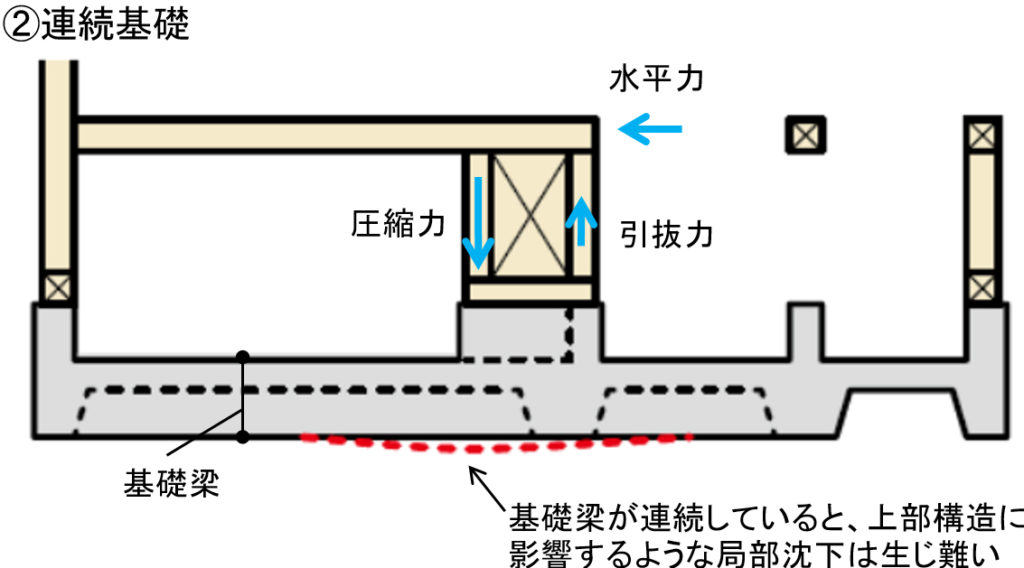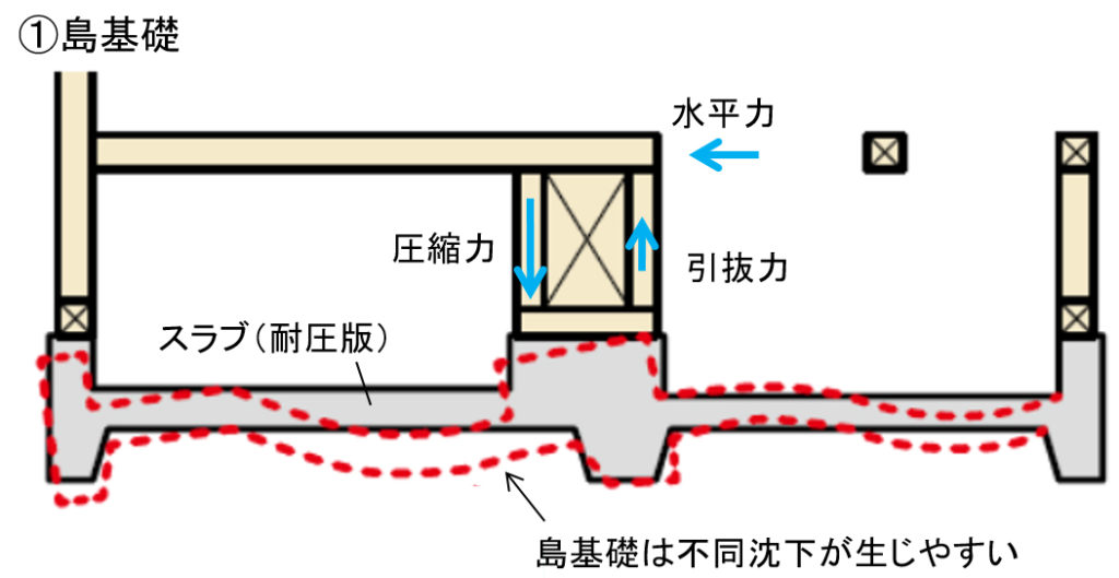 ■無筋基礎の場合は、壁倍率2.0程度の壁を分散配置して引抜力を抑えるのが構造計画上のポイントになります。また、連続していない島基礎に荷重がかかると沈下しやすいため、耐力壁は連続した基礎に載せるようにします。連続していれば、局部的に沈むことはないからです(図2)。
