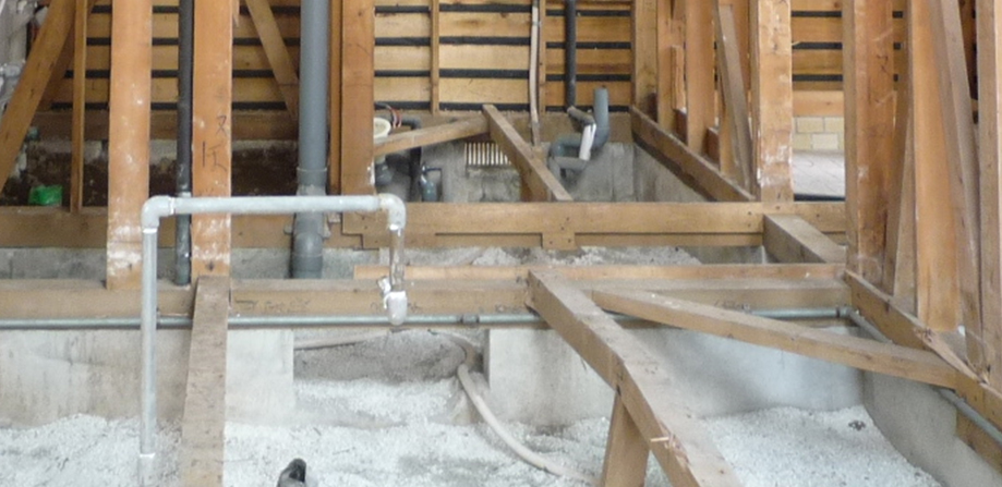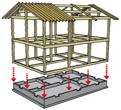 新築でも改修でも、コストに最も影響するのは基礎工事です。新築のときは、プランを考えてから上部構造を設計し、それに合わせて基礎計画を行うのが一般的です。2000年以降の木造住宅では、鉄筋コンクリートのベタ基礎が主流で、建物の外周と1階の柱および耐力壁の下に立上りを設けます。