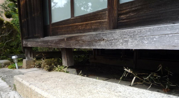 写真2 古民家の床下状況 軟弱地盤地域に建つ石場建ての古民家で、束石が所々沈み、不同沈下が著しい。このような場合はしっかりとした基礎を新設する必要がある。 |