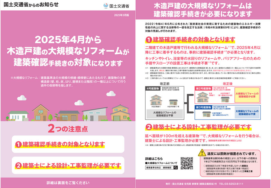 そして確認申請手続きは不要でも建築基準法への適合は必要で、構造や防耐火などの安全確保は設計者で適切にやるように指導するという、「設計者任せ=設計者の責任」であるところから「責任逃れ」をしているようです。違反すれば建築基準法における罰則付きだという「脅し」までつけ、しかもそれを「国土交通省からのお知らせ」という周知パンフレットに、わざわざ法改正直前の2025年3月に掲載しているのです。