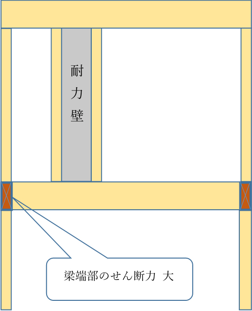 ちなみに、前述、在来仕口建物のなかで一部金物工法仕口を用いる場合ですが、梁上耐力壁がある場合などに利用することがあります。下図のように(極端な場合を想定)、梁上耐力壁がある場合に梁のたわみは断面的にOKだが、梁端部のせん断が厳しいことがあります。このような場合に、材種の変更、仕口形状の変更と併せて、金物工法仕口への変更を検討する場合もあります。その際にも、材種の適用範囲を確認しておく必要があります。