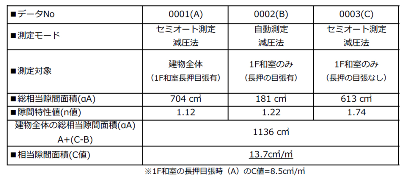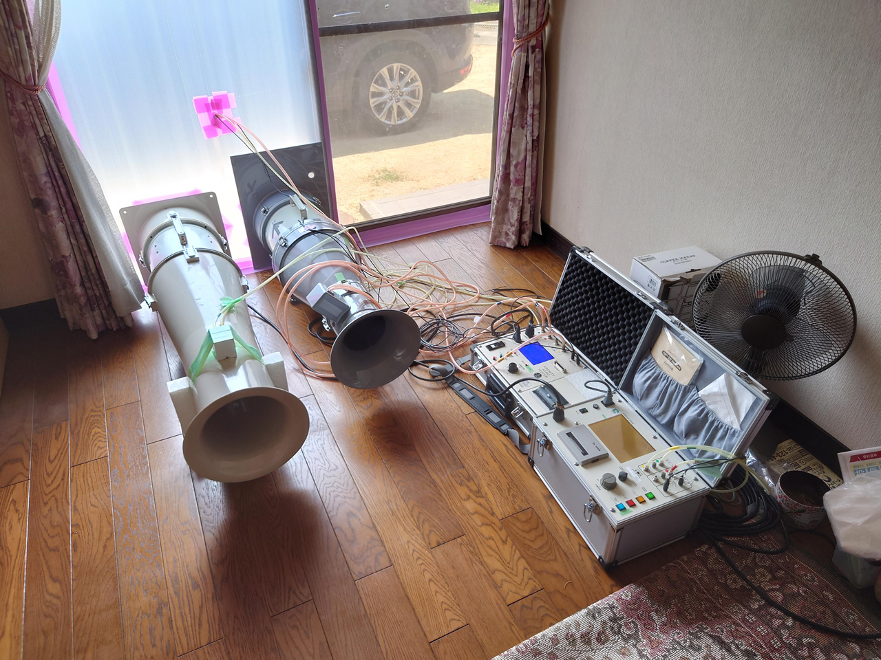 既存住宅のC値の測定結果は、あくまで参考ですが7~15cm2/m2くらいの建物が多い印象です。隙間が多い場合は測定器1台では機械の風量が不足するため、冒頭の写真のように気密測定器を2台並べて測定することもありますが、正確に測るのは結構難しく苦戦することも多いです。
