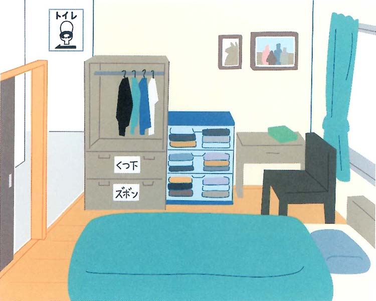 類似の対応には、“着替えが見つからない”課題には、着替えをタンスから出して籠などに入れて見えるようにする。引き出し内が見えない場合は、外側に「長そで」など入っているモノを文字、絵で表示する等があります。