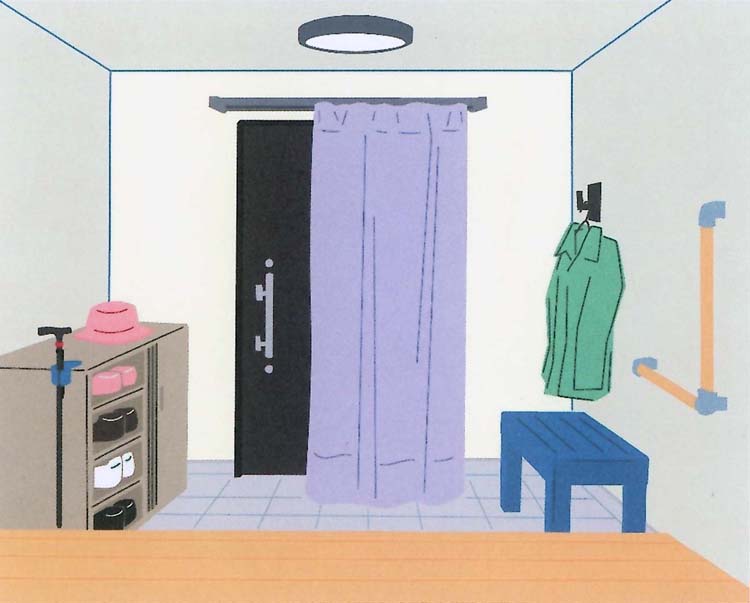 ドアを見えなくするカーテンの工夫(「認知症のひとの暮らしやすい住まいガイド」p7引用)