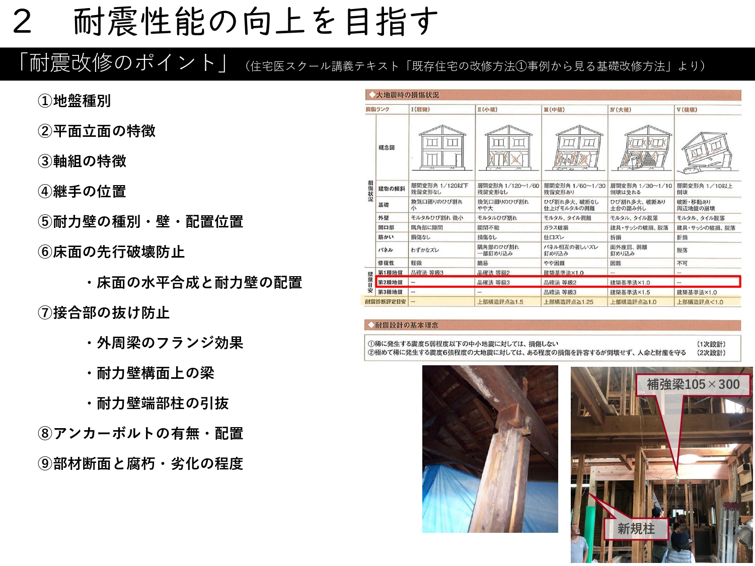 新築に手が届かない若年層の依頼者にも新築に並ぶ性能を確保できる方法を提案できることも必要です。できれば構造の専門家と相談できる関係をつくりつつも、自分自身が「耐震診断のポイント」をつかみ、構造専門化と議論できる力を持ちたいと考えます。