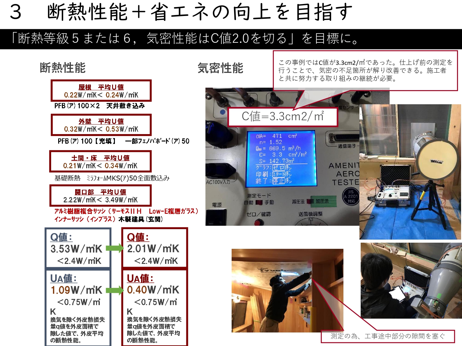 住宅医スクールでは、断熱・省エネ改修設計方法の講義を通してその必要性を強調してきましたが、施工者との連携で可能となる気密性能の向上について、いつまでも「課題である」と言っているのではなく、目標値を決めて、実行していくことが求められると考えます。