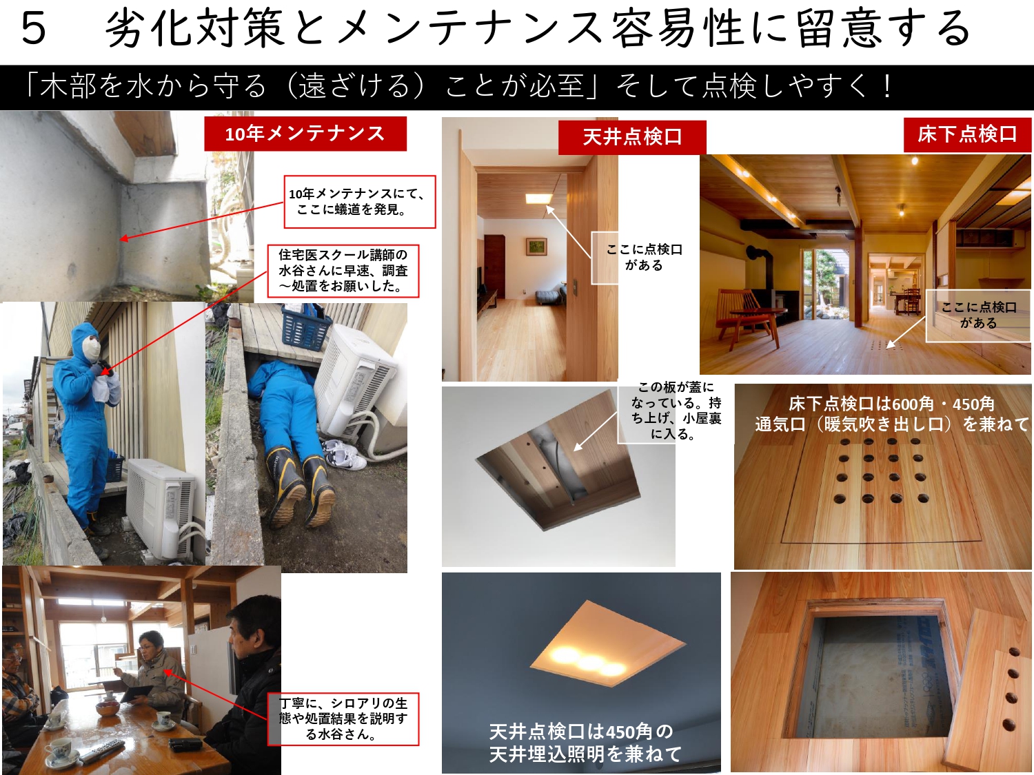 改修工事においては、既存建物での劣化の原因を把握し、対処療法でなく構本的に治すことが必至であります。また、長期間にわたる今後のメンテナンスのことを重要視し、メンテナンスしやすいつくり方や仕組みを取り入れていきたいと考えます。床下、小屋裏にはなるべく多くの、そして入りやすい点検口を設けることや、定期点検の仕組みづくりや、何かあった際にすぐにお願いできる専門家など、ネットワークの構築をしっかりつくり上げておく必要があります。