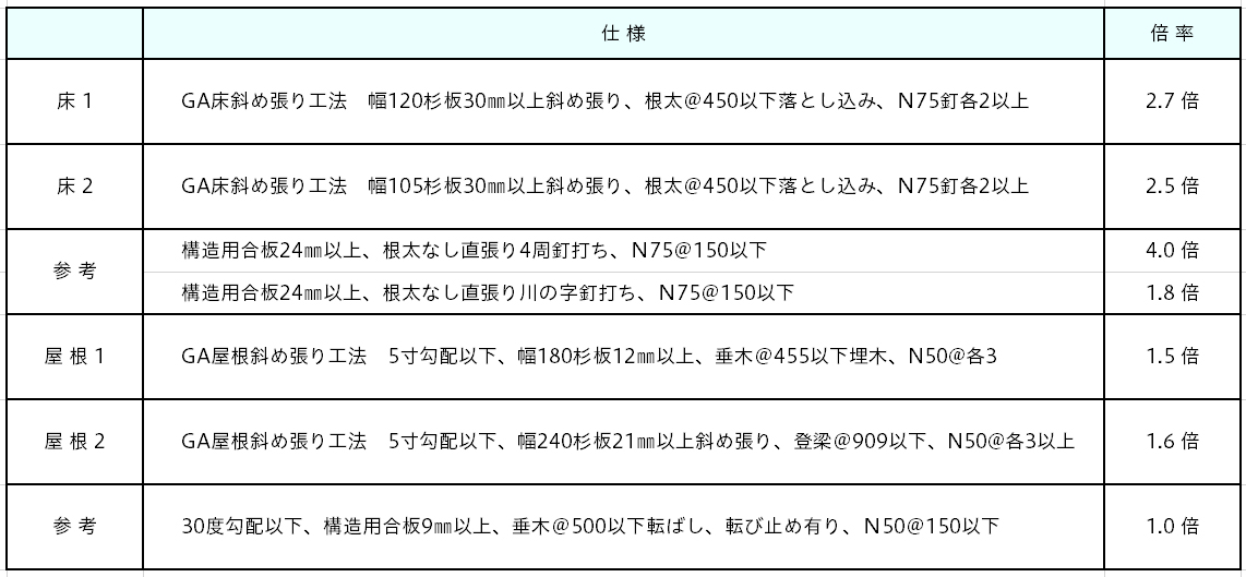 ■斜め張り工法の 第1の特徴は、構造用合板を使用せずに 耐震等級2 または 3を確保できることです。斜め張り工法は、床については、2.7倍または 2.5倍の床倍率を実現しました。また、屋根については、構造用合板の 1.0倍を上回る 1.6倍または 1.5倍の屋根倍率を実現し、構造用合板を使用せずに 耐震等級2 または 3を確保することができます。