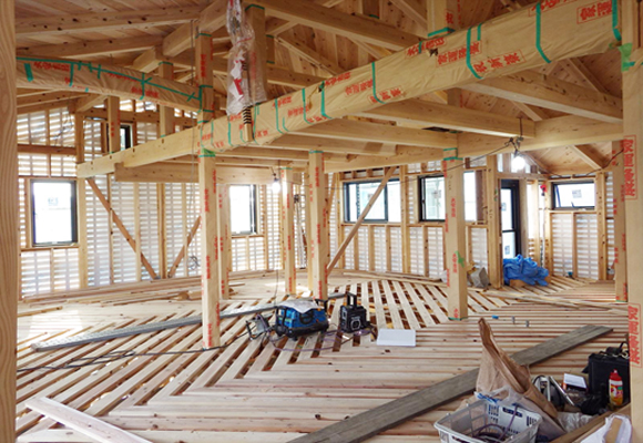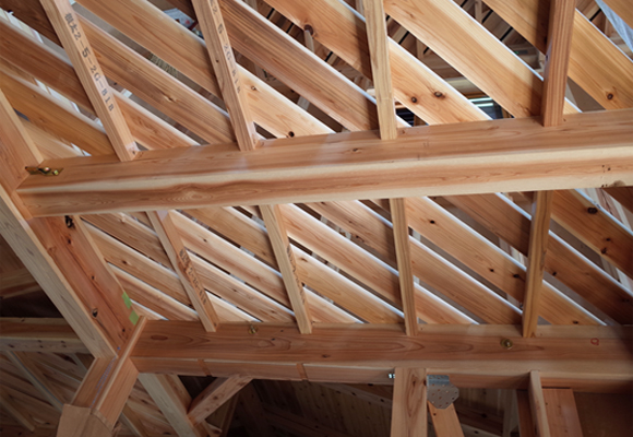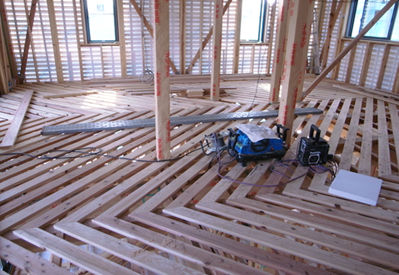 ■斜め張り工法のねらいは、地域で広く流通し、いつでも安価に入手可能な木材と地域工務店の施工技術を活かし、構造用合板を使用せずに、自然素材の良さを最大限に引き出した「木の家」をつくることにあります。