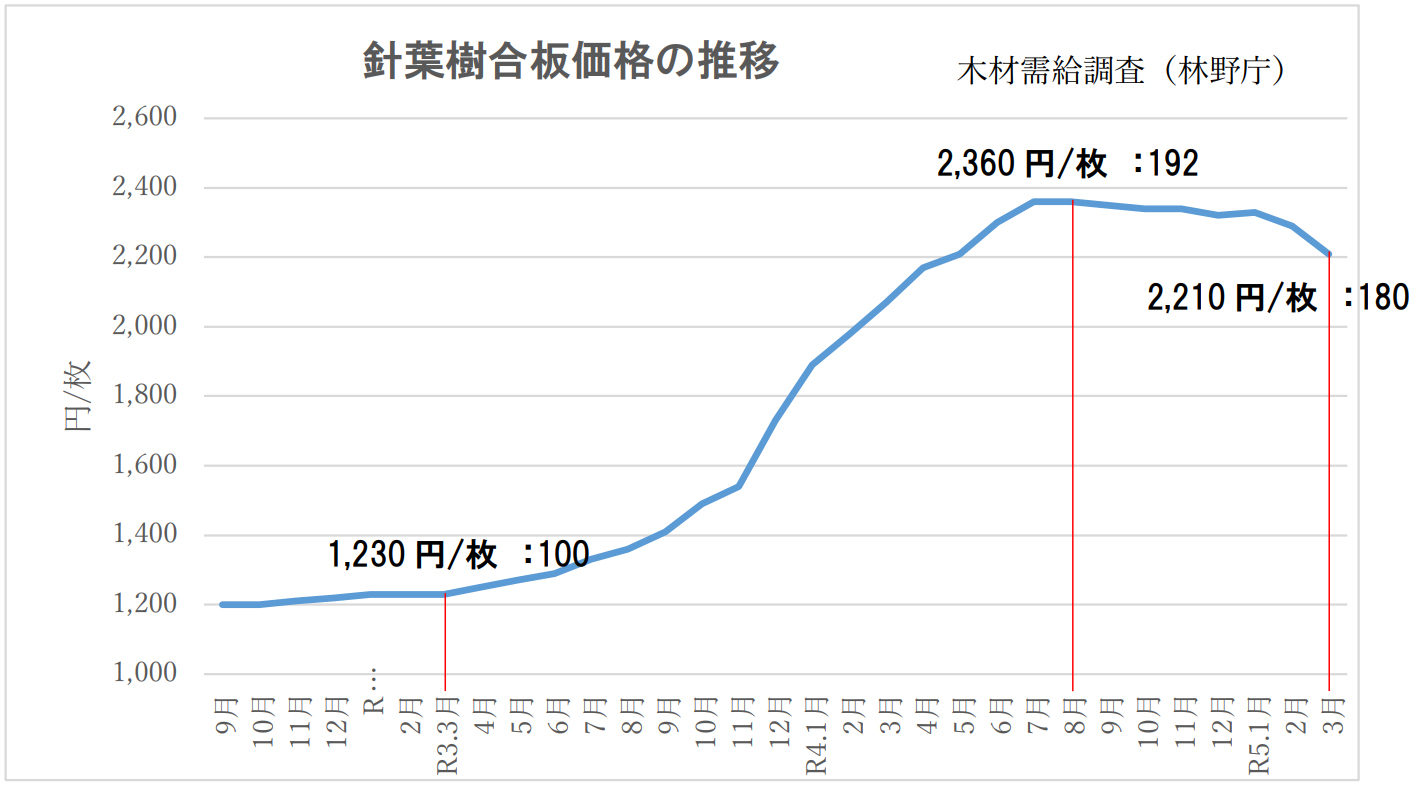 ■一方、日本では、国産針葉樹合板(910×1820×12㎜)の価格でみると、ウッドショック前に 1枚 1,200円(2021年 3月)だったものが、2022年 8月には 2,400円と 2倍まであがり、2023年 1月以降やや下げましたが、未だ 2,200円(2023年 3月)と約 1.8倍の高い水準にあります。杉正角材(120×120×3,000㎜)の価格は、68,000 円/㎥(2021年 3月)だったものが、2021年 9月に最高値の 139,000円/㎥と 2倍まであがり、その後 2023年 3月には 102,500円/㎥と約 1.5倍まで下げています。