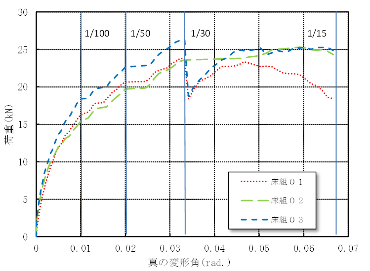 図. 床組試験体の荷重・真のせん断変形角包絡線 |