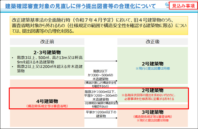 最近の説明会に用いられた資料によれば、旧4号(現行特例の範囲)から 新2号(改正法で特例対象から外れる範囲)に移行する建築物のうち、仕様規定の範囲で構造安全性を確認する確認申請においては、必要事項を「仕様表等」に記載することで、基礎伏図、各階床伏図、小屋伏図及び軸組図の添付を省略するなど、提出図書の合理化が図られようとしています。