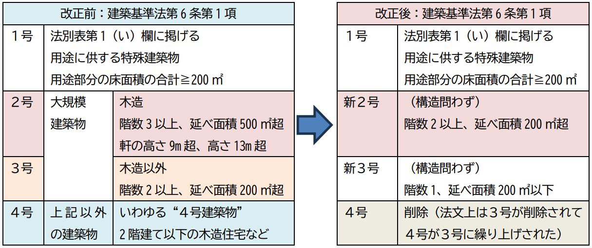 とはいうものの、2025年大改正によって、建築基準法における木造住宅の位置づけが大きく変わることは間違いないです。最も大きな違いは、改正前に4号だった木造2階建て住宅が、改正後には 新2号 に該当することです。現行は建築物の用途・規模に応じて 法6条1項1号~4号に区分されていますが、改正後は2号と3号が合体して 新2号となり、3号が削除されて4号が 新3号に繰り上げられます(ここでは 2025年改正後の 法6条の区分を「新2号」「新3号」と表しています)。