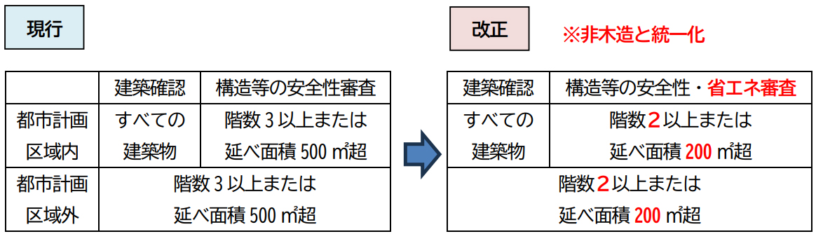 法6条の区分見直しにより現行の「4号特例」が縮小され、4号の木造2階建て住宅は、特例対象から外れて 新2号に該当し、確認審査・検査省略の対象であった構造規定が審査対象となります。さらに建築物省エネ法の改正により、原則すべての新築住宅は省エネ基準適合が義務付けられ、省エネ基準に適合しているかどうかに関して、確認審査・検査の対象となります。
