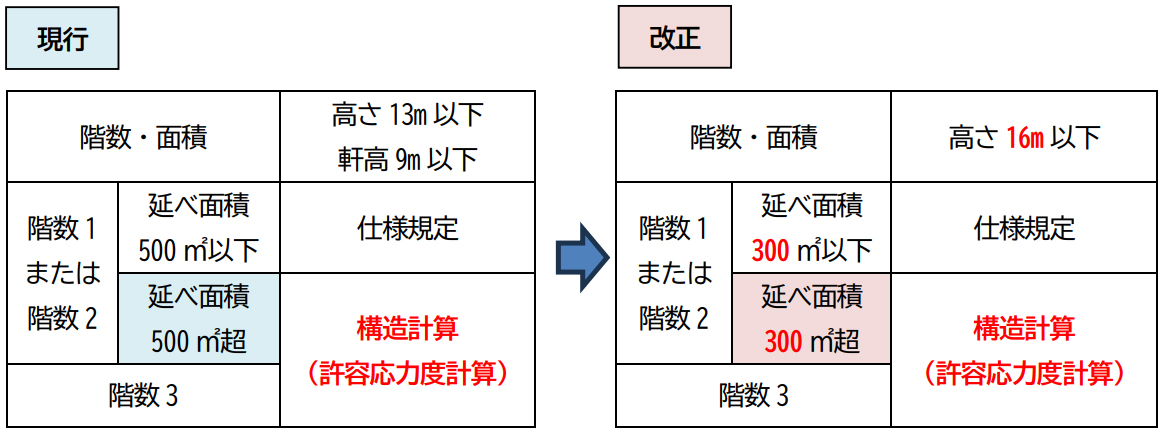 すなわち、同じ木造2階建て住宅であっても、300㎡以下であれば構造図書の提出は必須ですが、構造計算の提出義務はない、ということになります。ここで最も注目すべきなのは、話題にしている「仕様規定」の適合確認対象において、現行で「高さ13m以下・軒高9m以下」の規模が、改正後は「高さ16m以下」に、ある意味「緩和」されてしまうということです。構造計算の対象となる面積は「500㎡」から「300㎡」に強化されますが、一方でより構造安全確認の条件が厳しいと考えられる「高さ」は緩和されてしまう、ここにも矛盾を感じています。