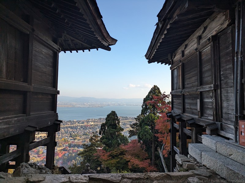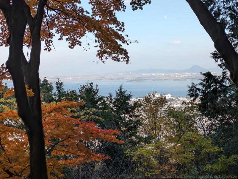 2棟の間から、琵琶湖を眺めました。この背面には大きな岩が飾られてます。見たい方は、ぜひ登山を楽しみならが、見学してみてください。