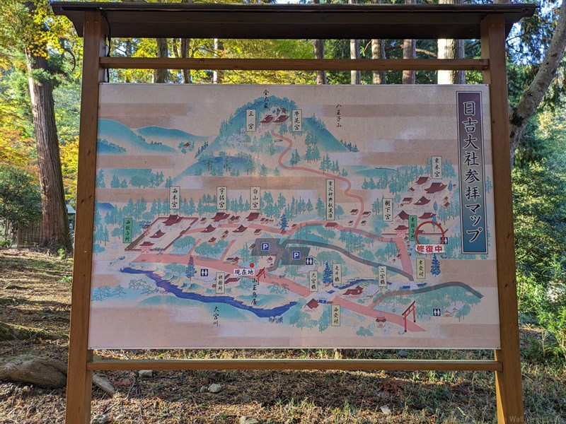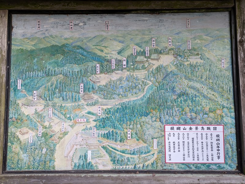 60分ほどの登山でようやく、建物群に到着。上醍醐の地図を見ると、建物が点々としています。時刻は15時半なのでちょうど1時間の登山でした。