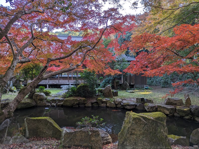 山のくぼ地に作られ、屋根の美しさと懸造り、周囲の樹木が見事に調和しています。