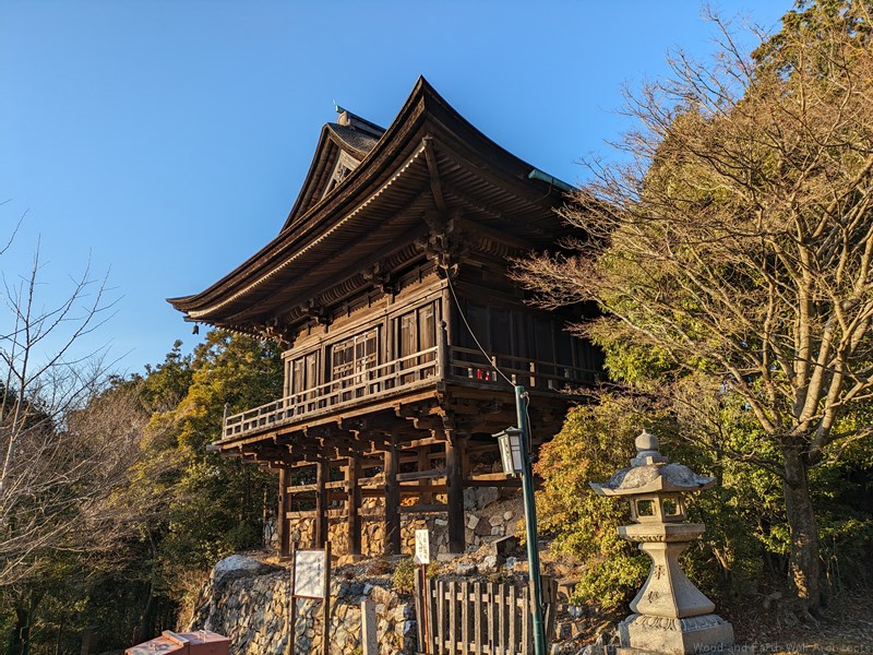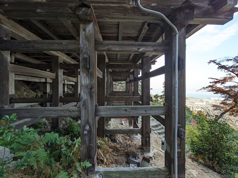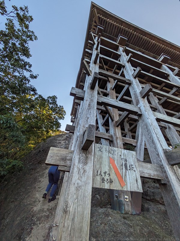 鎖坂を登ります。え!まさか!と思うところですが、懸造りの構造に目がいっていました。貫が斜めに入り隅柱と緊結され、筋かいもあり足元にはボルト締め。斜めに貫が入っている建物を初めてみました。