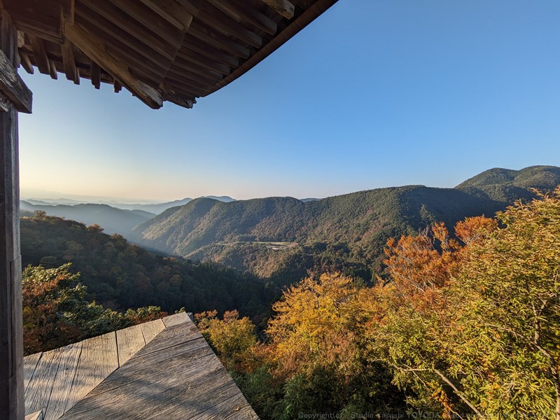 懸造りの横を上りきり、建物内に入ると絶景です。手摺がないのでちょっと怖いですが、デッキに腐りもなく健全。ここまでで約40名の方とすれ違いました。ツアーで来られている方が多く、ガイドさんも一緒に登られていました。