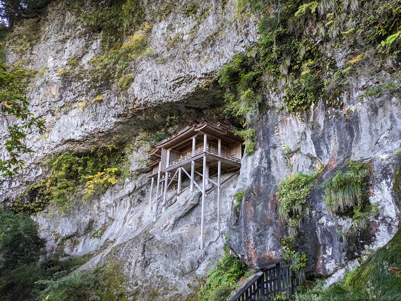 へこみがある岩肌にそっと載せたような建物です。柱は面取りがされ8角柱ですが、最近やり変えたような話でした。磯崎新さんや六角鬼丈さんも見学に来た古建築です。