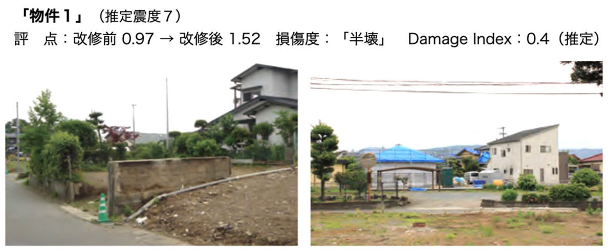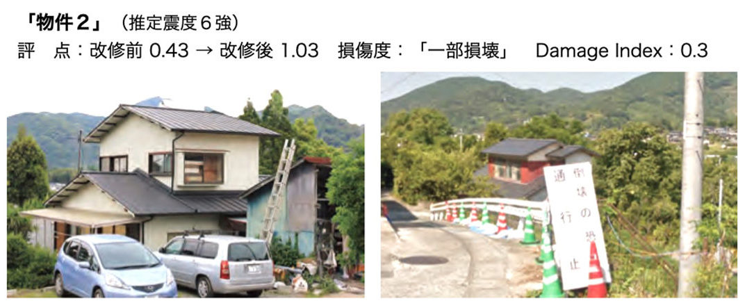 熊本市西区の東端にある図3の物件です。やや急峻な丘の上にあり、周辺地盤の変状と震度マップから現地の震度は6強と推測されます。評点は改修前の0.43を1.03までアップしています。筋かいの新設2箇所、筋かいの取り替え4箇所、構造用合板の取付5箇所に加え、屋根の軽量化も実施しています。被害は北側と東側の外壁モルタルの落下がありましたが、建物全体の残留変形はほとんどありませんでした。損傷度は「一部損壊」, Damage Indexは0.3です。