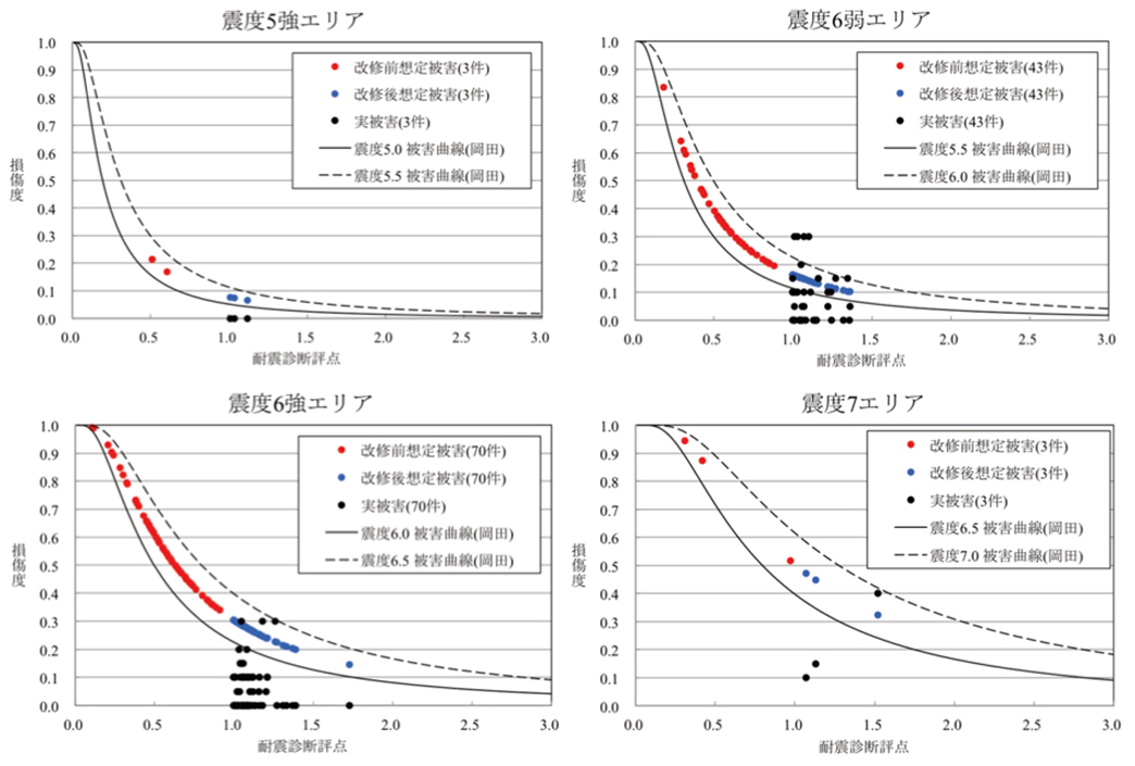 以上のような調査を熊本市内の耐震改修物件119棟について行い、耐震診断評点と損傷度(Damage Index)の関係を想定震度エリアごとに示したのが、図4です。損傷度は0.1〜0.4が 一部損壊、0.4〜0.6が半壊、0.6以上が全壊に対応します。図中の点線と実線は、文献²⁾ で提案されている耐震診断評点と損傷度の関係を表す曲線で、各震度エリアの下限(実線)と上限(点線)を示しています。また、図中の赤いプロットは調査対象物件の耐震改修前の評点とその評点のときの想定被害、青いプロットは耐震改修後の評点とそのときの想定被害です。そして黒いプロットが調査で得られた実際の被害です。黒いプロットがどこに分布しているのかを見てみると、いずれの震度エリアでも実際の建物被害のほとんどは青いプロットよりも被害が小さく、その多くは損傷度0.1以下、つまり無被害であった割合がとても高くなっています。実際の地震被害から見ても、耐震改修の効果が明確に現れています。