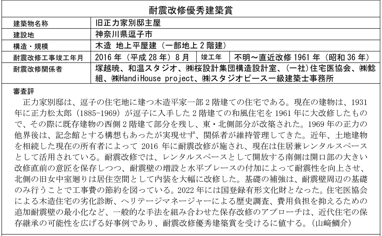そんな正力邸が、一般財団法人 日本建築防災協会主催 / 耐震改修優秀建築・貢献者表彰制度において[ 2023年度 耐震改修優秀建築賞 ]を受賞いたしました。表彰名は文化財登録名称「 旧正力家別邸主屋(きゅうしょうりきけべっていおもや)」となります。