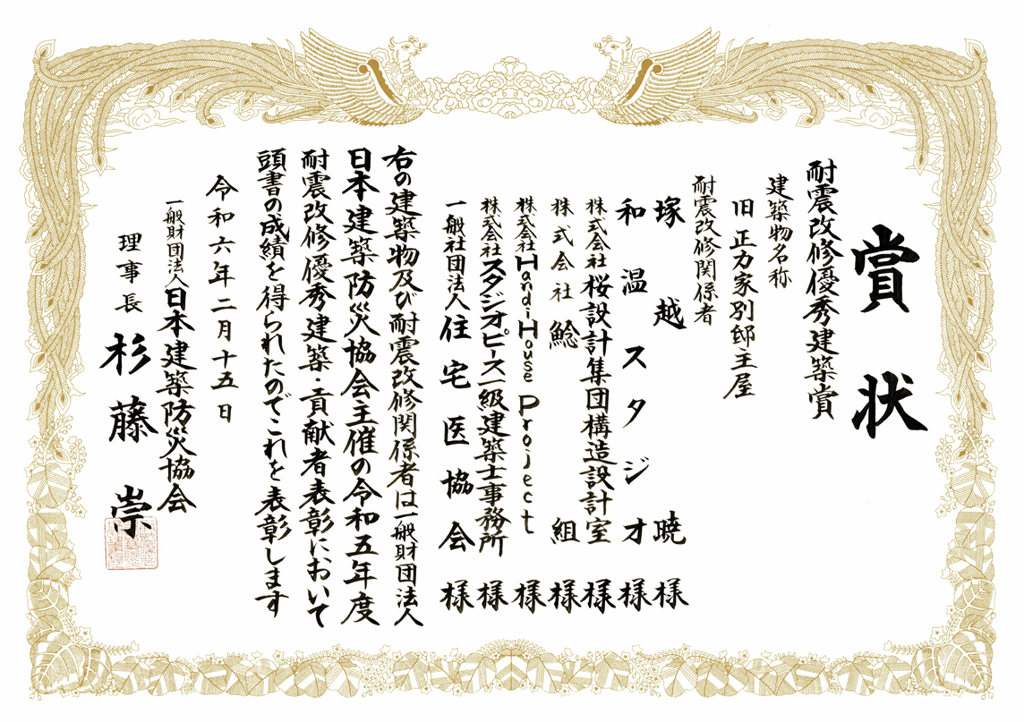 国土交通省や防災・構造に関わる主要機関が後援する大変名誉ある賞ということもあり、これまで受賞した建物は名実ともに大きい建物ばかりなので、受賞速報を受けた時には大変驚きました。住宅医協会ならびに正力邸改修時に御協力いただいた関係者の皆様に、この場をもちまして、改めて心より感謝を申し上げます。