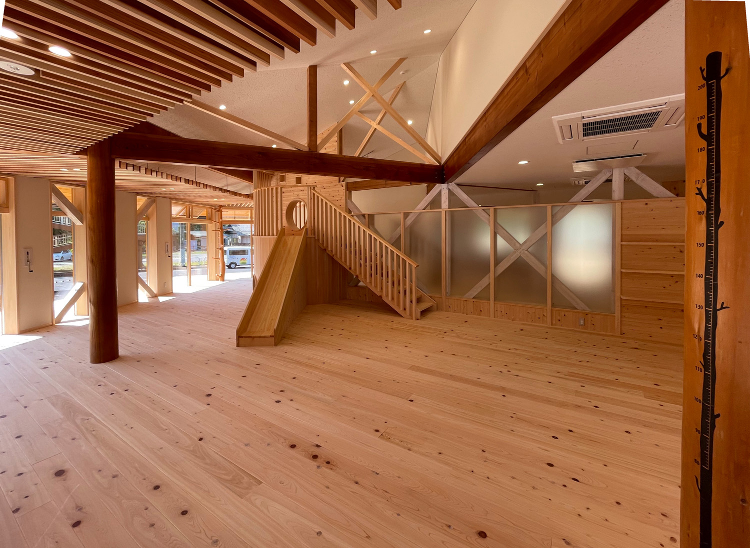 無事竣工を迎えた森の木遊館は、付知の文化が育まれた森への入口として、来場者を出迎えています。外部・内部には県内の地域材がふんだんに使われ、室内には切株をイメージしたサワラとヒノキのシンボルツリーを配置し滑り台を設置しました。ガラス越しに周辺の山並み感じながら、赤ちゃん連れの親子や地域の子供たちに木の素材やたくさんの木のおもちゃに触れて遊んでいただいています。